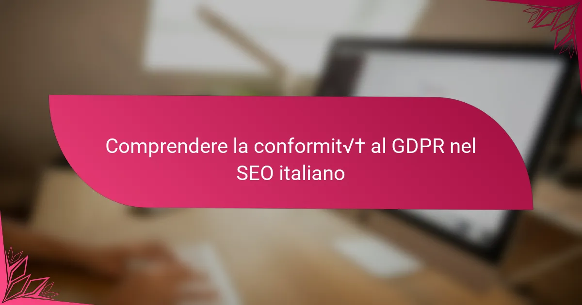 Comprendere la conformità al GDPR è essenziale per un’efficace SEO italiana, poiché richiede l’implementazione di pratiche che proteggono i dati degli utenti mentre migliorano la visibilità sui motori di ricerca. I componenti chiave includono l’istituzione di politiche sulla privacy trasparenti, la sicurezza del consenso degli utenti e l’adesione ai principi di minimizzazione dei dati per allinearsi alle normative stabilite dal Regolamento Generale sulla Protezione dei Dati.